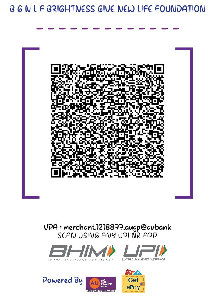 NAME : B.G.N.L.F BRIGHTNESS GIVES NEW LIFE FOUNDATION A/C : 2302255654458021 IFSC : AUBL0002556 BRANCH: HSR LAYOUT